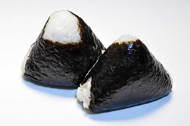 Onigiri are Japanese rice balls, shaped like fat triangles and wrapped in nori (seaweed). They are a popular street snack due to being small and portable, and easy to eat; some shops in Japan exclusively sell onigiri. Fillings can vary from umeboshi (pickled plums), salted fish or mustard greens, but are usually sour and/or salty. Unlike sushi, the rice used for onigiri is plain and not salted.