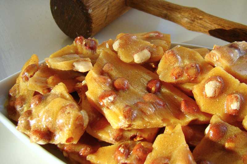 Brittle is a hard, crunchy candy made by cooking sugar until it caramelizes and then mixing in nuts or seeds before letting it cool and harden. Peanut brittle is the most common variety eaten in the United States. Many countries have their own versions of brittle, such as in India, where a candy called chikki is made by combining roasted peanuts or sesame seeds with melted jaggery (a type of unrefined sugar).