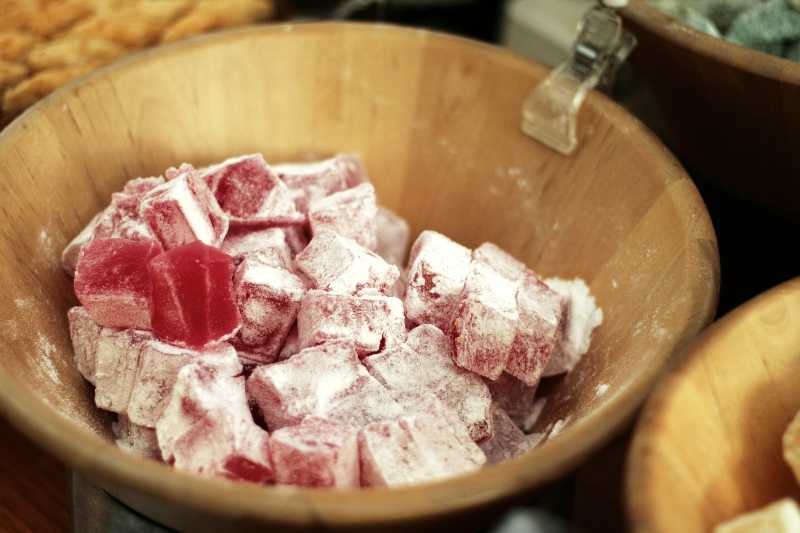 Turkish delight originated in the Ottoman Empire several centuries ago and is made by cooking sugar and water with starch until the mixture thickens into a gel. It is then flavored and allowed to set before being cut into small cubes. One common flavoring is rosewater, which is made by steeping rose petals in water and then adding it to the mixture. Turkish delight is also often flavored with pistachios, walnuts, lemon, or orange, though pretty much any flavor can be added to it.