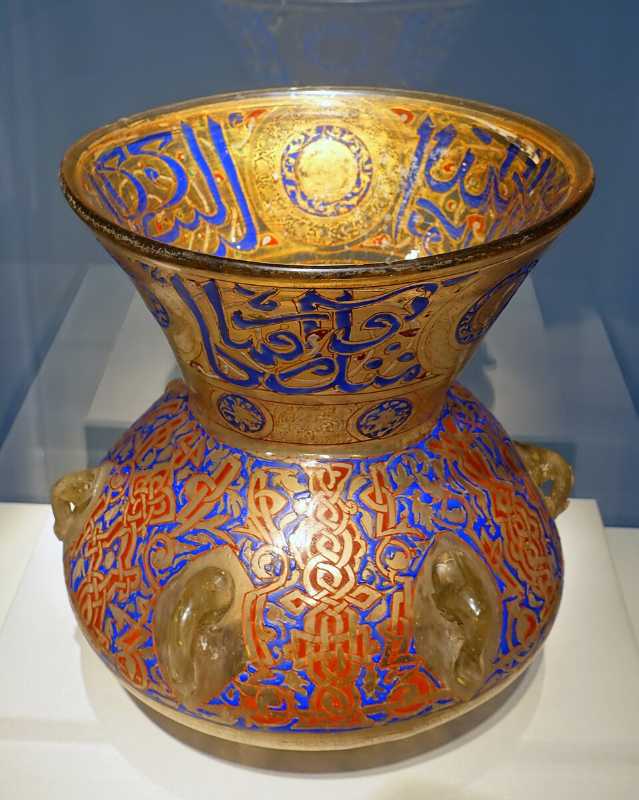The beautiful artifact in the photo is an Egyptian mosque lamp dating from 1360. The glass is decorated with gilding and vitreous enamel, which produces brilliant, long-lasting colours. While Islamic glassware is occasionally decorated with figures of humans or animals, lamps meant to light houses of worship conformed to the traditional Islamic ban on the depiction of living creatures. Therefore, this lamp is decorated with calligraphy and elaborate geometric patterns in vivid shades of blue, red and gold.