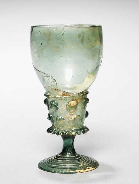Natural forest glass was characterized by various shades of greenish-yellow (usually due to iron impurities in the glass mixture), as shown by the 16th-century goblet in the photo. This style of drinking glass, generally used for white wine (whose colour was enhanced by the glass' green tinge), is known as Berkemeyer. It is characterized by a thick, hollow stem covered with prunts, small blobs of glass that made it easier for drinkers to grip the glass.