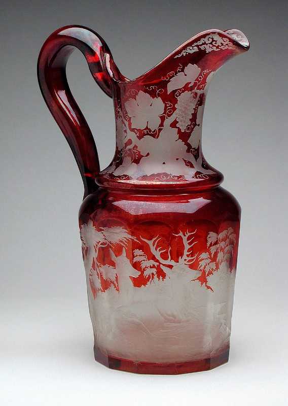 Decorative Bohemian glassware is crafted with a variety of techniques, including hand-cutting and engraving. The pitcher in the photo, dating from the mid-19th century, is made of ruby-flashed glass - a type of glass created by coating a mass of molten colourless glass with one or more thin layers of coloured glass prior to blowing. Here, the red glass was partially etched away to reveal images of animals and plants.