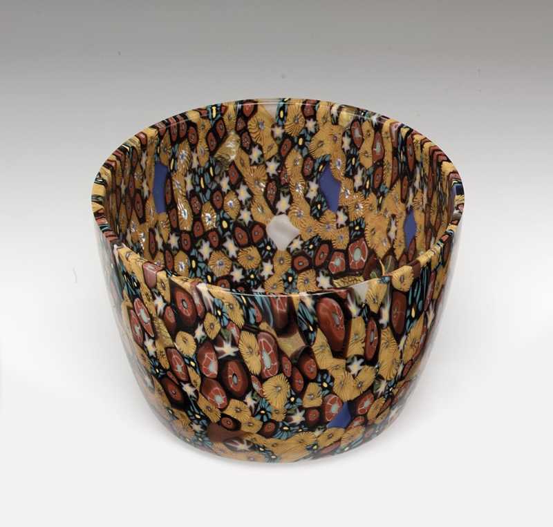 Millefiori consists of long, thin glass canes with multicoloured patterns (known as murrine), sliced into small discs and then fused together to create a multitude of different designs. The bowl in the photo was created around 1880 by Italian glassmaker Vincenzo Moretti (who specialized in the manufacture of millefiori items) for the Venice-Murano Glass Company.