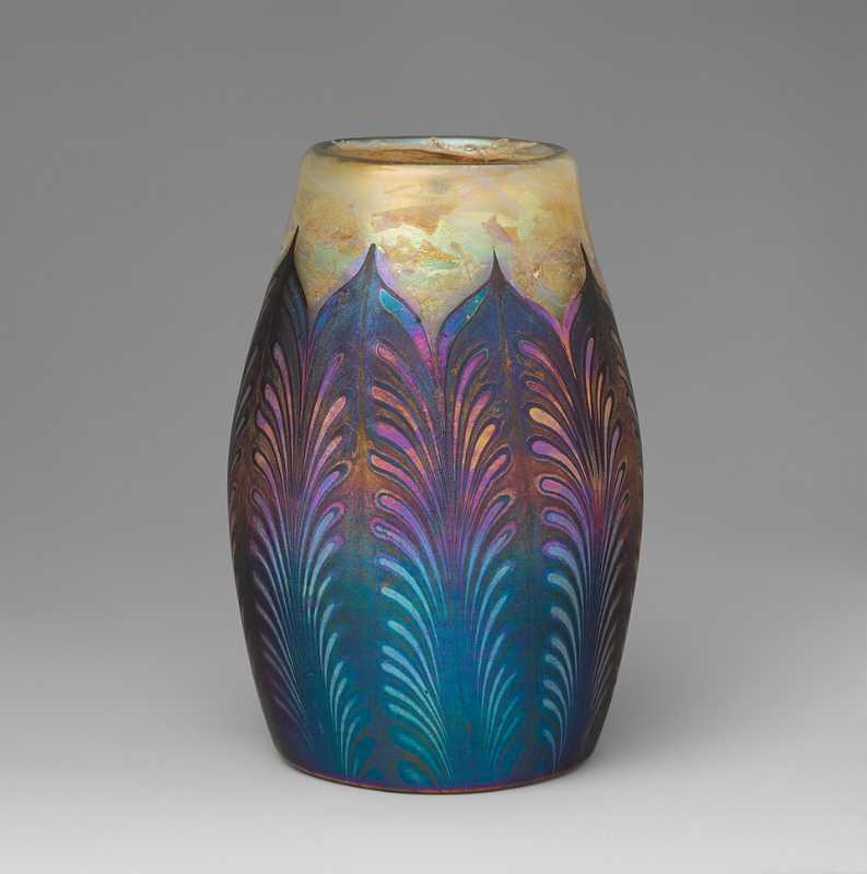 Among Tiffany's most distinctive creations there is Favrile glass, inspired by the iridescent Roman and Syrian glass that he had seen in European museums. Developed in his New York factory by a skilled English chemist, Arthur J. Nash, Favrile glass is a kind of lustre glass with a softer, satiny finish rather than a mirror-like one, achieved by a very complex process. Favrile (whose original name was Fabrile, an Old English word meaning "handcrafted) was patented in 1892, and at the 1900 Paris Exposition was awarded a grand prize. The vase in the photo, displaying some of Favrile glass' distinctive colours, dates from about 1906.