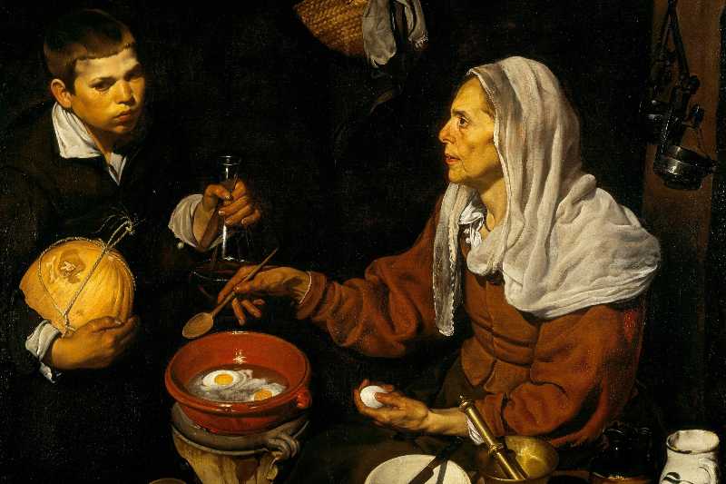 Diego Velázquez's "Old Woman Frying Eggs," painted in 1618 when he was still a teenager, is an example of the Spanish "bodegón" genre. "Bodegones" were paintings that depicted everyday life, especially scenes set in kitchens or taverns, often with a strong focus on food, utensils, and common people.