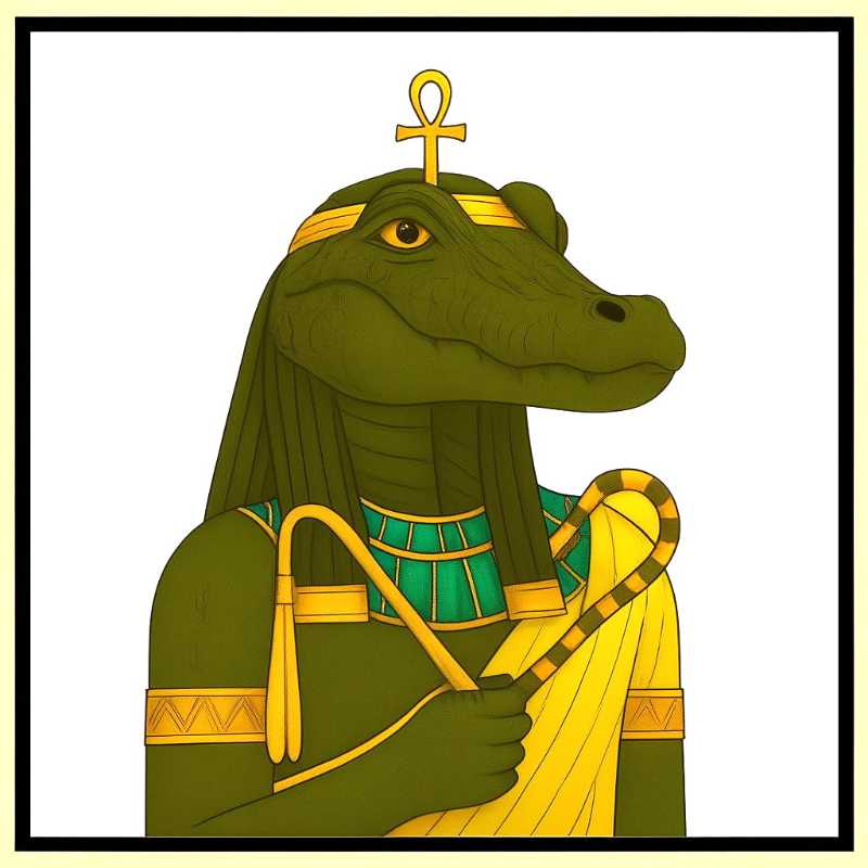 Sobek was the ancient Egyptian crocodile god, depicted either as a full crocodile or as a man with a crocodile head. He was the god of the Nile River, fertility, military prowess, and pharaonic power.
