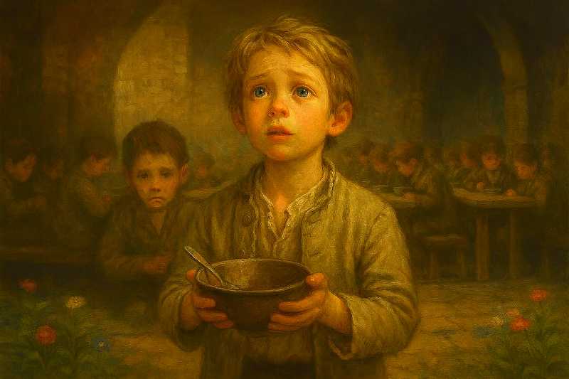 The picture is of the orphaned Oliver Twist asking for more gruel in the workhouse. The story follows Oliver as he escapes to London from his abusive employer, an undertaker, and is taken into a den of thieves and pickpockets ruled by the villainous Fagin.