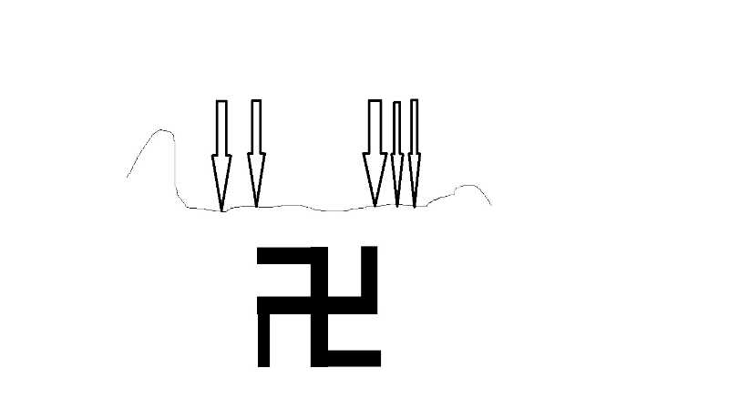 I've tried to sketch the outline of the coast of Normandy, with a swastika indicating the German occupation during WW II. I've added five arrows roughly pointing to the landing zones on D-Day (June 6, 1944): from east to west Sword, Juno, Gold, Omaha and Utah. All this to make a pictorial guide to the 1962 movie "The Longest Day".