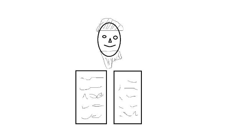 This is indeed a very odd sketch. You can see a face, with something hanging down that is supposed to look like a white beard. Below this face are two tablets with something scribbled on it. What would this silly sketch intend to depict? Well, a white-bearded man is how I would figure Moses, and the two rectangles are two stone slabs inscribed with the Ten Commandments.