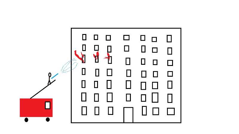 This sketch is an oversimplification of the movie title involved. I've outlined a seven floor building with fire coming out of the windows on the fifth floor (fourth in European terms - Europeans don't count the ground floor). A single fire truck has arrived and one person tries extinguishing the fire.