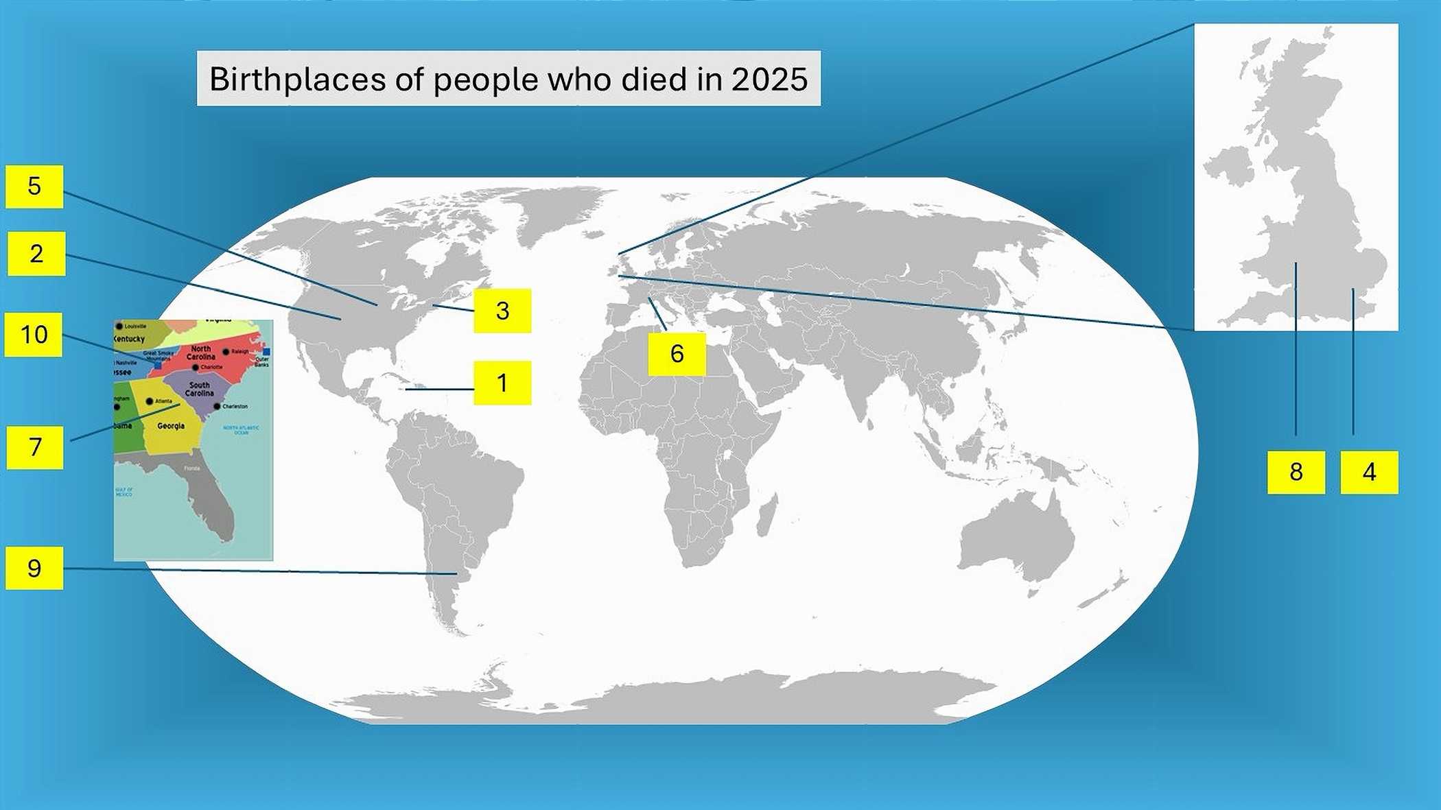 Death is inevitable, but when notable people die, we can reflect on their contributions to public life. Here are but a few notable people who passed on in 2025. Your task is to identify their birthplace.