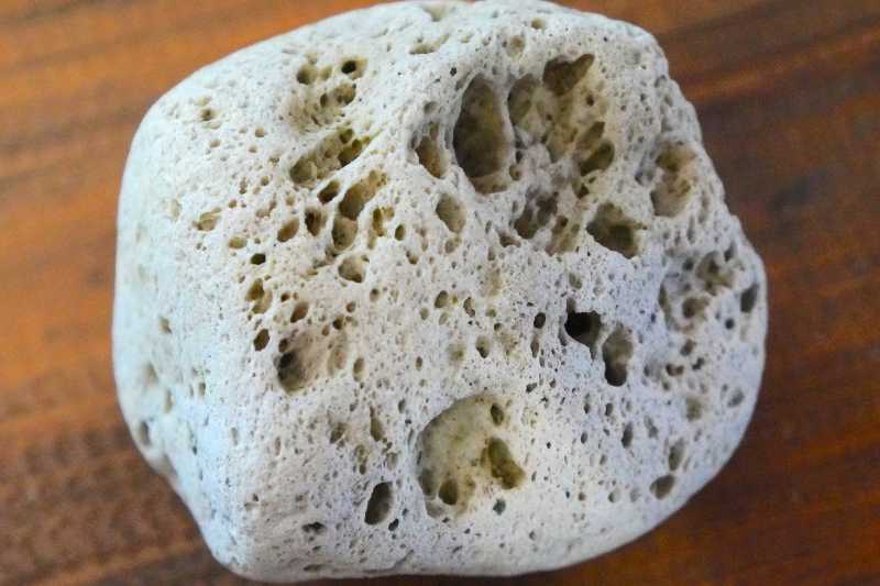 Pumice is a type of igneous rock. It is created when molten rock with a high amount of dissolved gas erupts from a volcano and cools very quickly. As the lava cools, the gas bubbles become trapped inside, leaving many tiny holes. Because of its rough surface, pumice is often used as an abrasive material for smoothing skin or polishing surfaces.