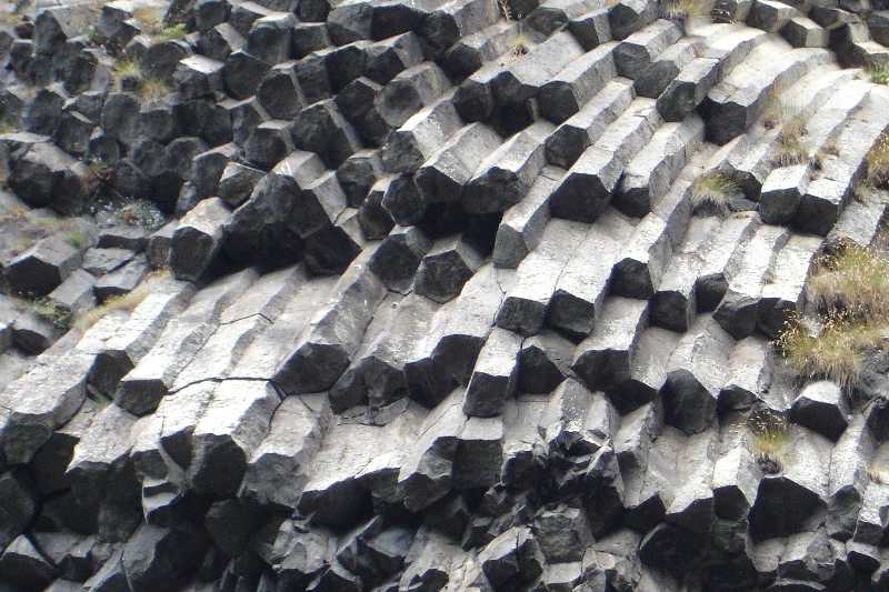 Basalt is a type of igneous rock. It forms when lava erupts and cools quickly at the surface, creating very small crystals and a smooth, fine-grained texture. In some places, basalt forms hexagonal columns. It is one of the most common types of rock in the Earth's crust and makes up much of the ocean floor.