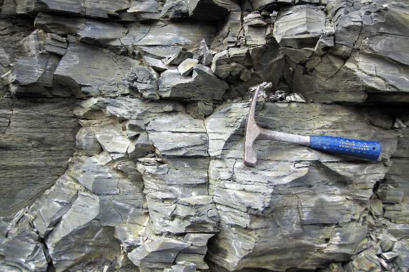 Shale is a type of sedimentary rock. It forms when clay and mud settle in calm bodies of water and are gradually buried and compressed over time. As more layers build up on top, pressure turns the soft mud into solid rock. Shale often splits easily into thin layers because of the way the particles are arranged.