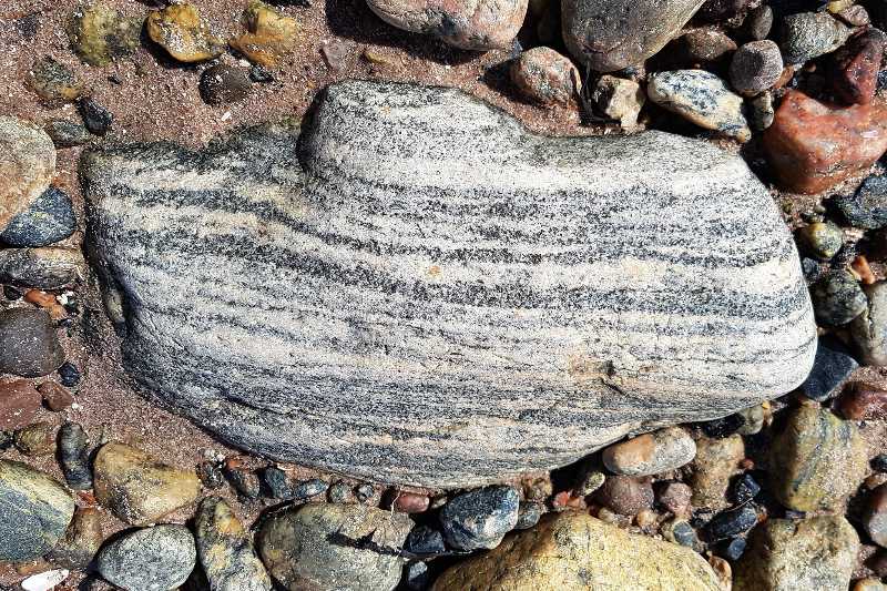 These bands give gneiss a layered or striped appearance. Unlike some other metamorphic rocks, gneiss does not split easily along flat surfaces.