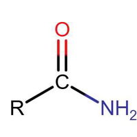 Not to be confused with the similarly named "amine" group, an amide group contains a carbon-oxygen double bond connected to a nitrogen atom. It can be thought of as a combination of a carboxylic acid and an amine. Like many other organic molecules, amides can be primary, secondary, or tertiary: a key difference here is that this refers to the groups bonded to the nitrogen atom, not the carbon atom. The amide in the picture is a primary amide, as the nitrogen is bonded to one non-hydrogen group. Secondary and tertiary amides are those in which the N atom bonds to two and three non-hydrogen groups respectively.