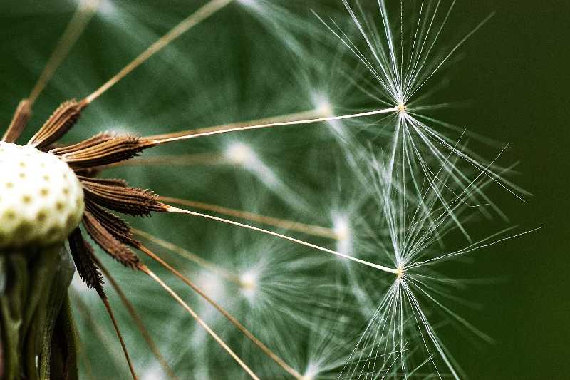 Dandelion seeds are tiny and light, each one attached to a soft, white fluff that forms the round, puffy ball seen on mature dandelions. Each seed is brown and narrow, about one-eighth inch (0.3 centimeters) long, with a tiny parachute-like structure that allows it to float on the wind.