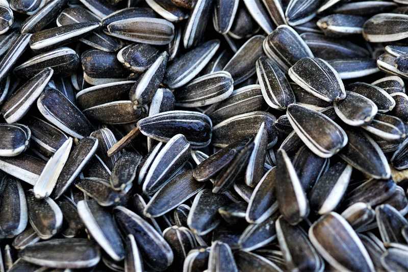 Sunflower seeds are medium-sized, flat, and oval with a hard outer shell. They are typically black, gray, or striped with white, and the kernels inside are pale and soft. Each seed is about half an inch (1.3 centimeters) long, though size can vary by variety.