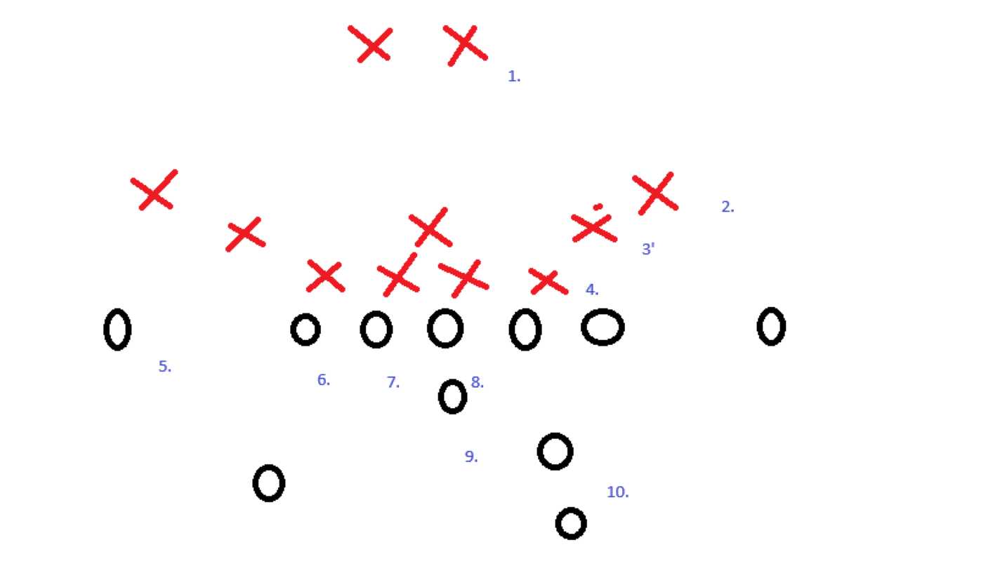 The defensive end can be found at either end of the defensive line. They are assigned the numbers 50-79 and 90-99. The role of the defensive end is to keep the players "contained"-that is not letting it get "outside".