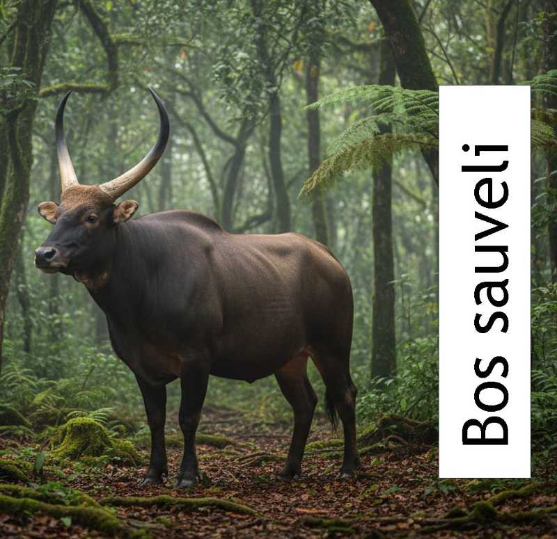 The kouprey (meaning 'forest ox' in the Khmer language), or the grey ox, may be extinct in the wild with the last confirmed sighting in 1969. It was first described in 1937 and has been the national animal of Cambodia since 1960 as well as being the nickname for the national football team. For wild cattle, they are of relatively light build with the males being darker coloured than the females.