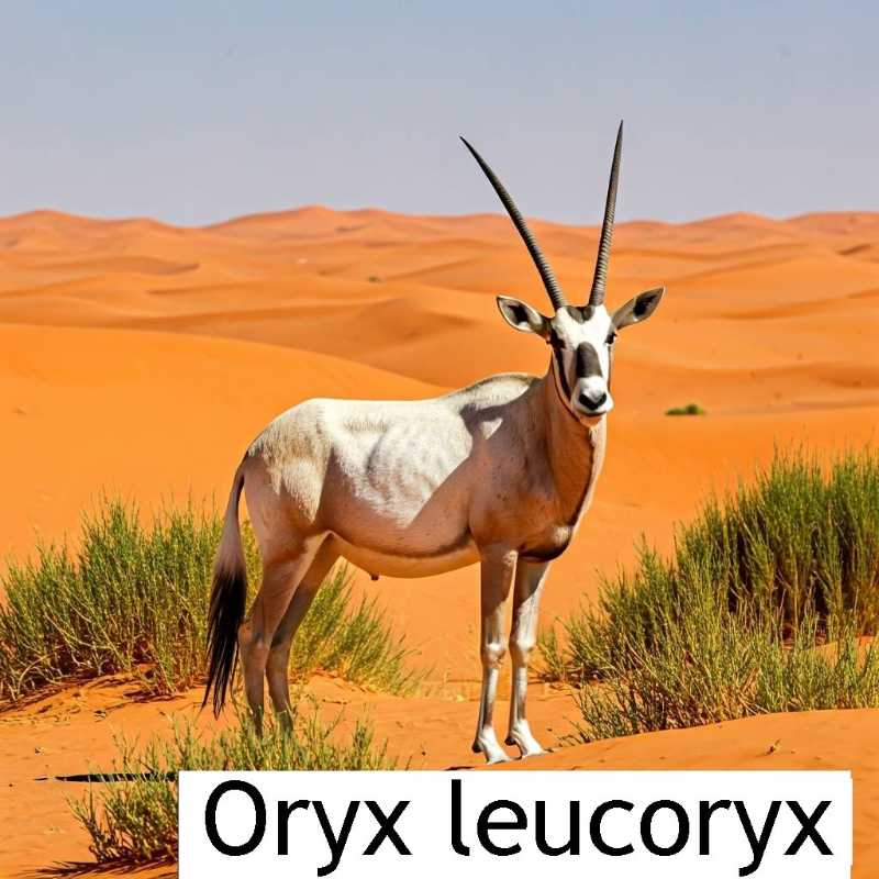 A straight-horned type of antelope, the Arabian or white oryx is native to desert and steppe areas of the Arabian peninsula. Historically its range probably took in most of the Middle East but it was hunted to extinction in the wild by 1972. The animal was re-introduced from zoo populations from 1980 which resulted in it becoming the first animal to move from 'extinct in the wild' status to 'vulnerable'. Estimated 2016 populations were 1,220 in the wild with around 6,500 in captivity.