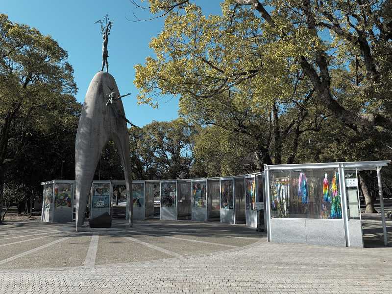 6. This statue is commonly called the Children's Peace Monument. What kind of item is displayed in the glass cabinets that flank it?