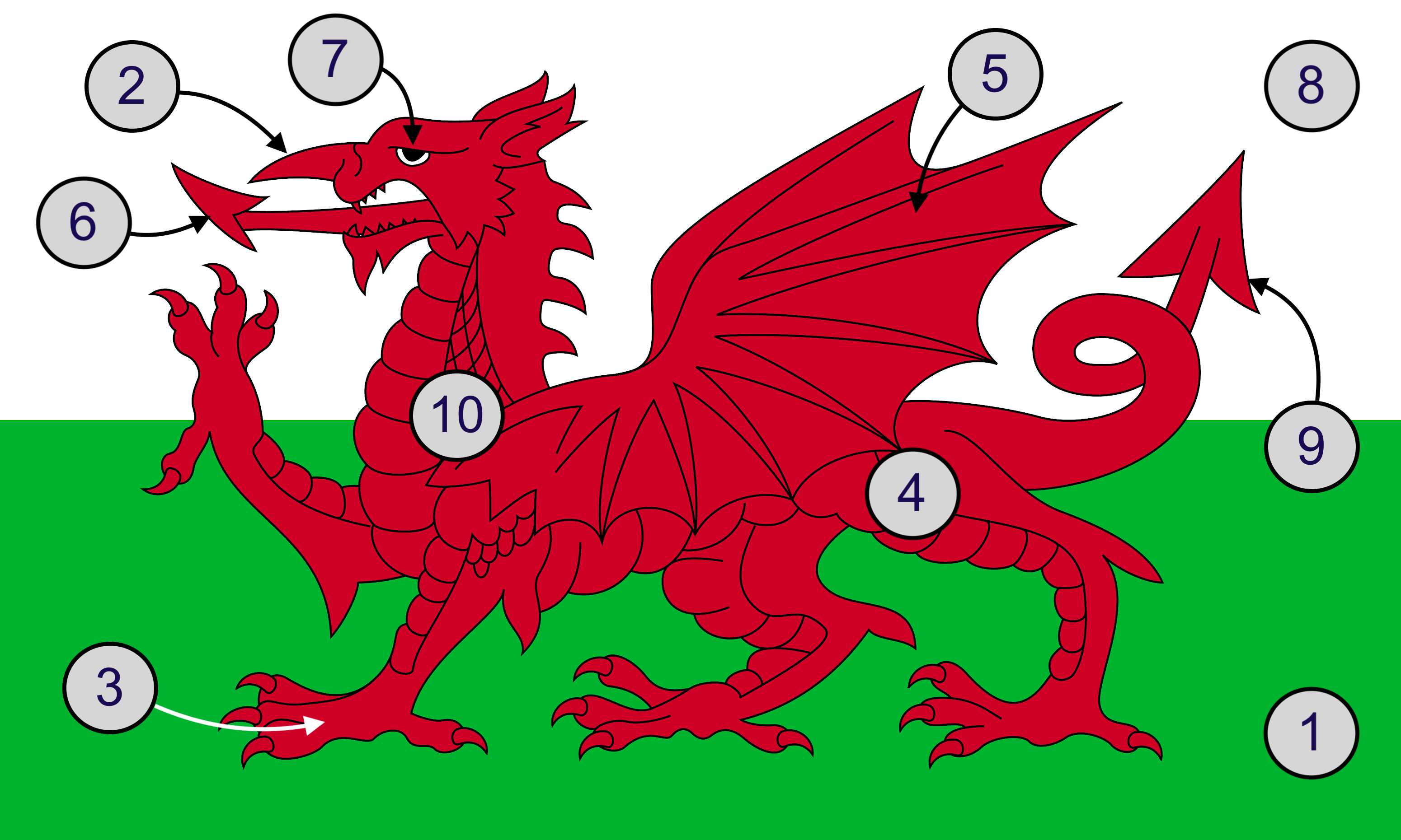 GwyrddDraigTrwynCynffonGwynAdainCochTafodTroedLlygad* Drag / drop or click on the choices above to move them to the answer list. View Image Attributions for This Quiz